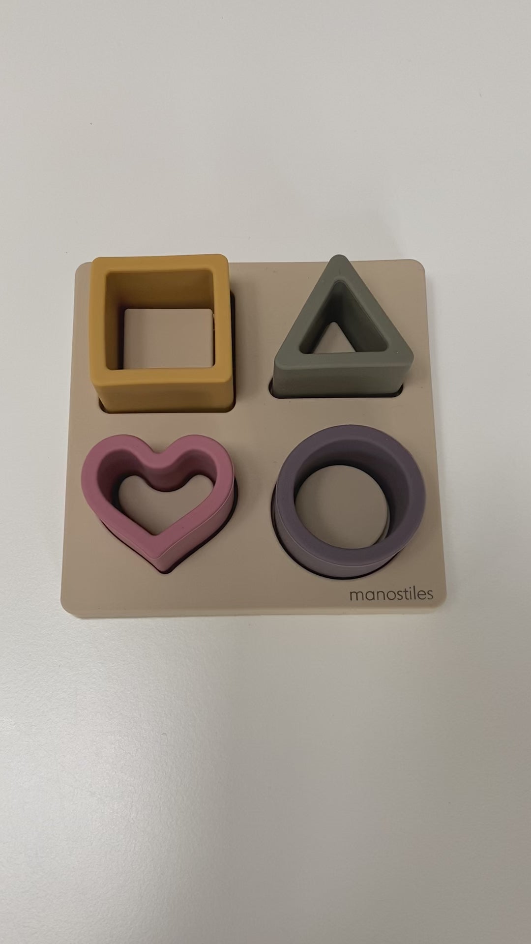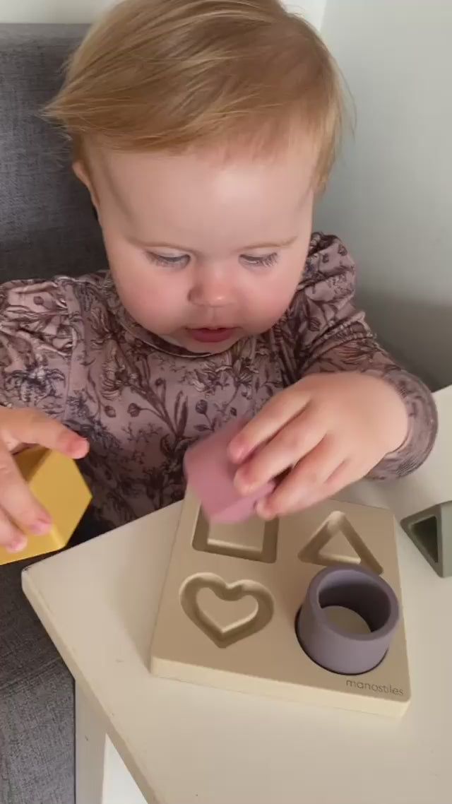 Puslespil til de mindste fra Manostiles er lavet i silikone og dejlig blødt for barnet og barnet får udviklet sine sanser ved at føle - smage og se de forskellige former og får udviklet finmotorikken når formene skal sættes tilbage på pladen.